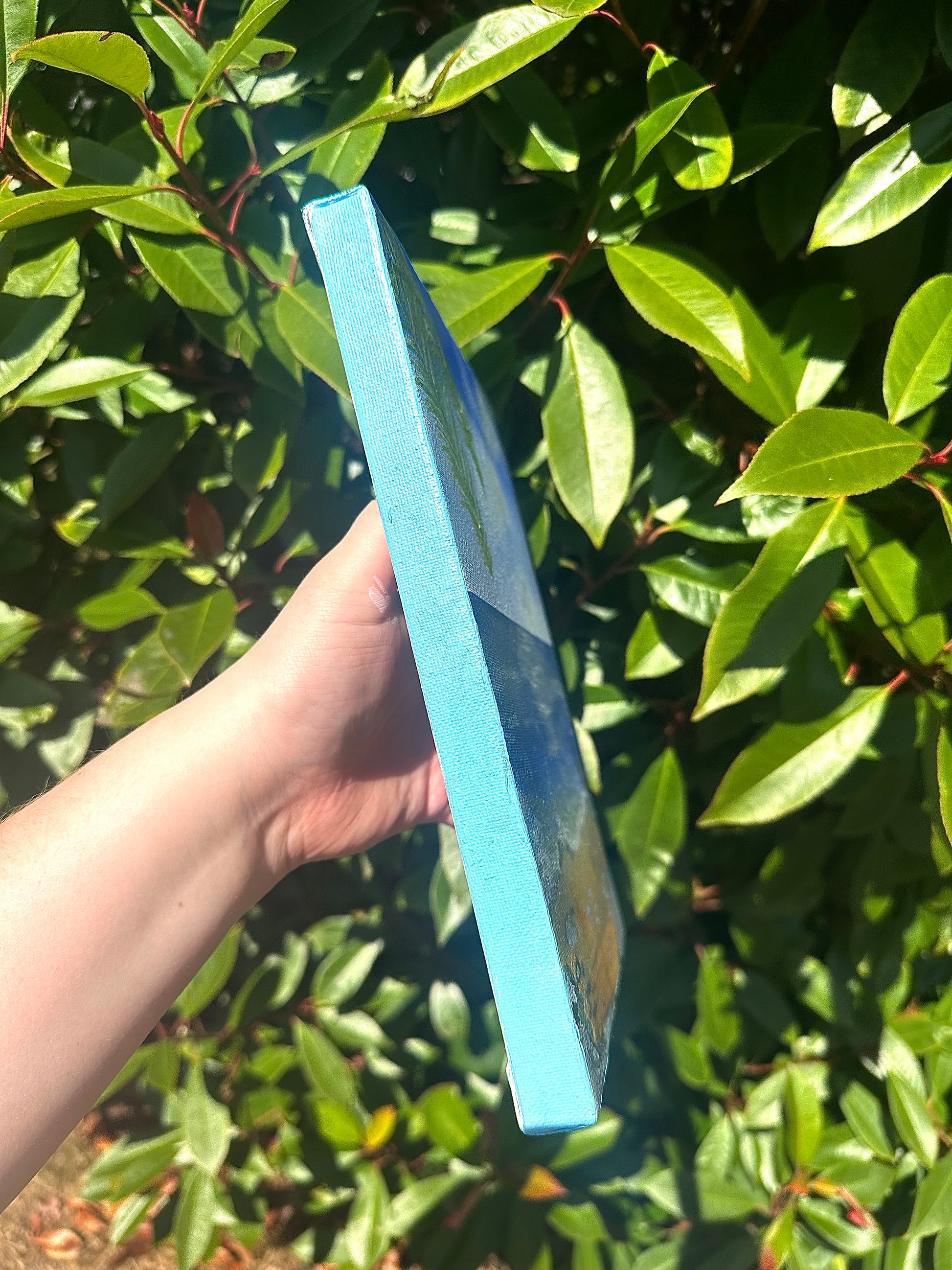 Original acrylic seascape painting featuring a golden sandy shore, deep blue ocean, and palm leaves swaying against a bright sky. A serene, tropical escape for your wall. (10 x 8 inches)