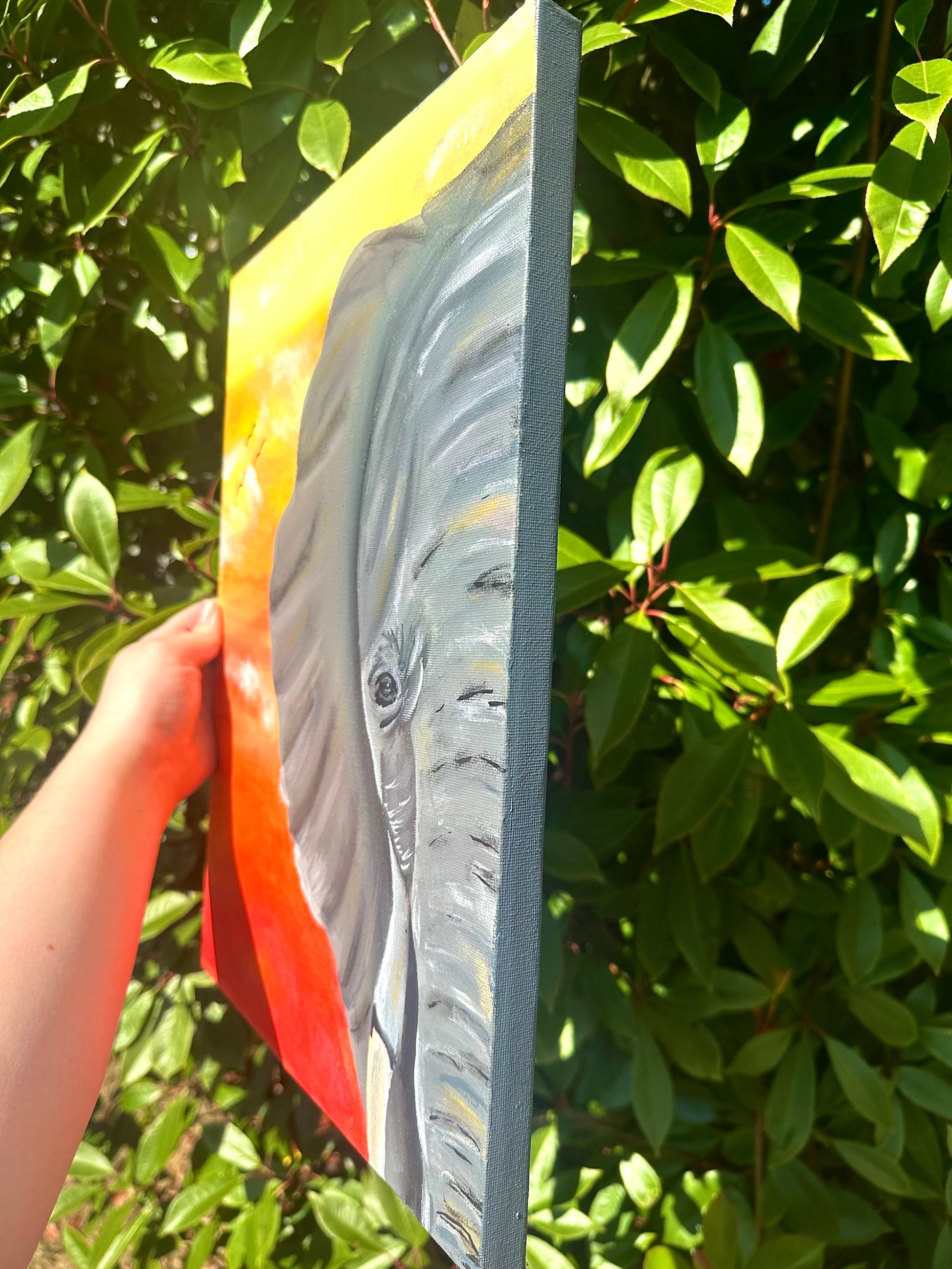 This original acrylic painting captures the gentle power of an elephant against the backdrop of a vibrant sunset. The composition balances realism and atmosphere, focusing on the elephant’s presence and the warmth of nature.Painted entirely with acrylic on a single canvas, this piece reflects themes of strength, serenity, and the beauty of wildlife. (16 x 12 inches)
