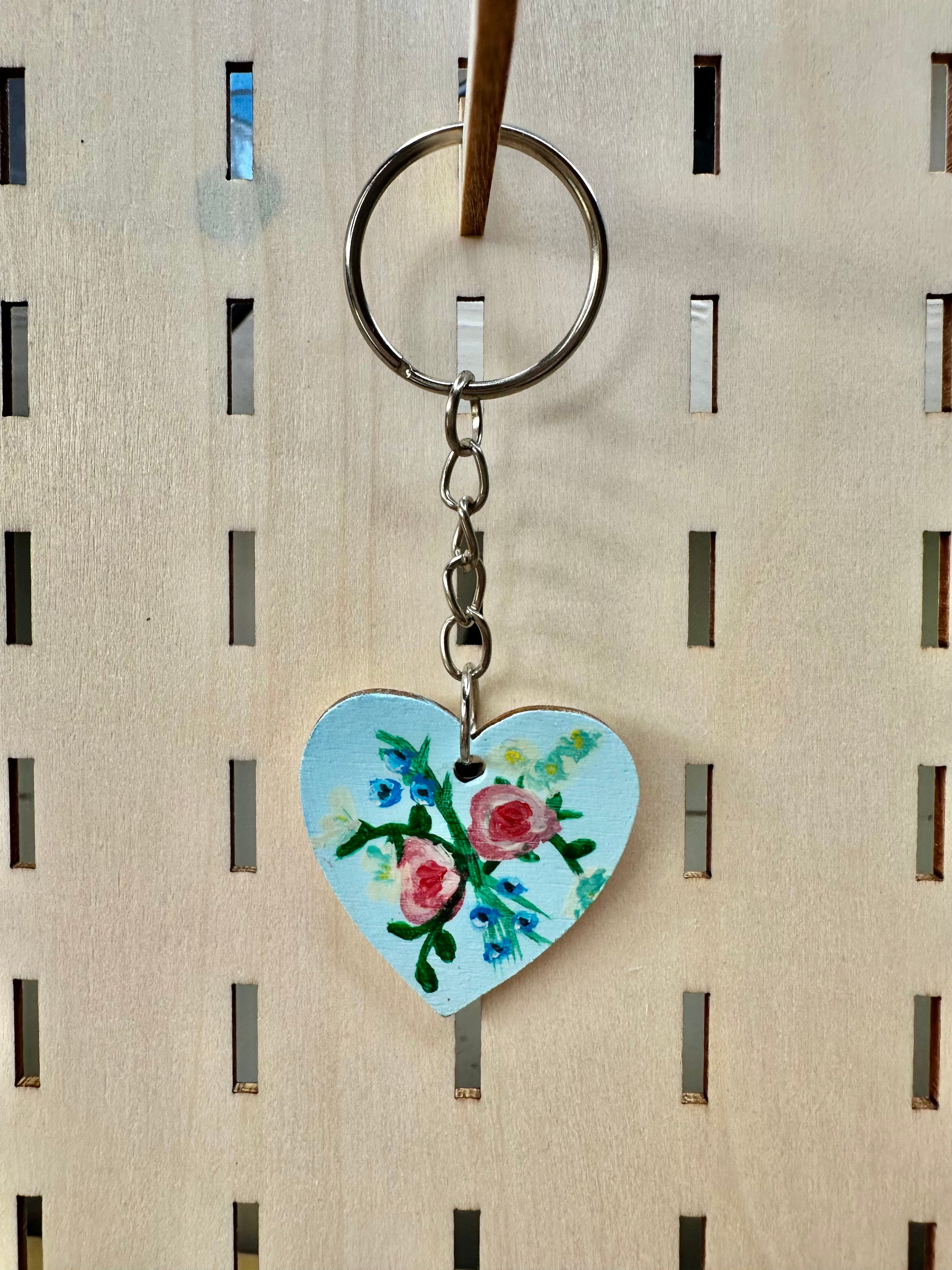 A handmade wooden keyring, carefully hand painted with acrylics and finished with a protective varnish for durability. Lightweight and sturdy, it’s ready to clip on to your keys, bag, or zipper pull adding a unique, handcrafted touch wherever you take.