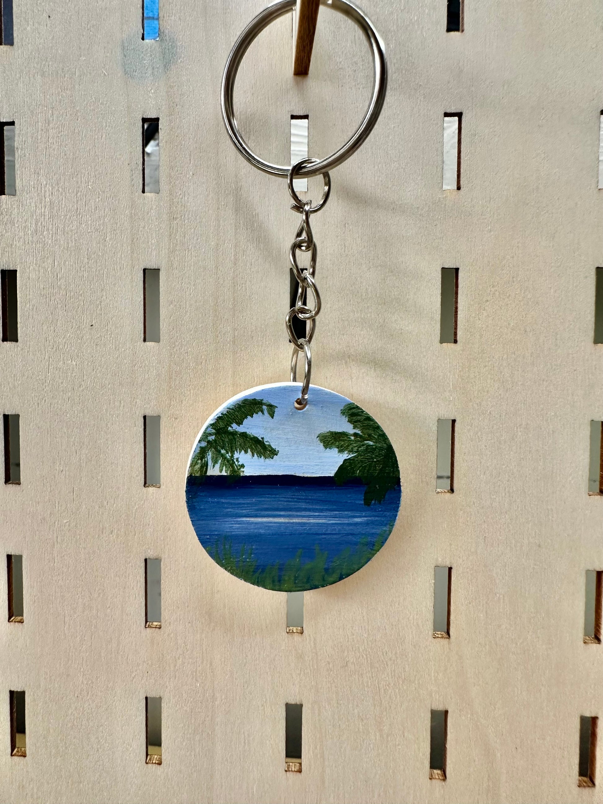 A handmade wooden keyring, carefully hand painted with acrylics and finished with a protective varnish for durability. Lightweight and sturdy, it’s ready to clip on to your keys, bag, or zipper pull adding a unique, handcrafted touch wherever you take.