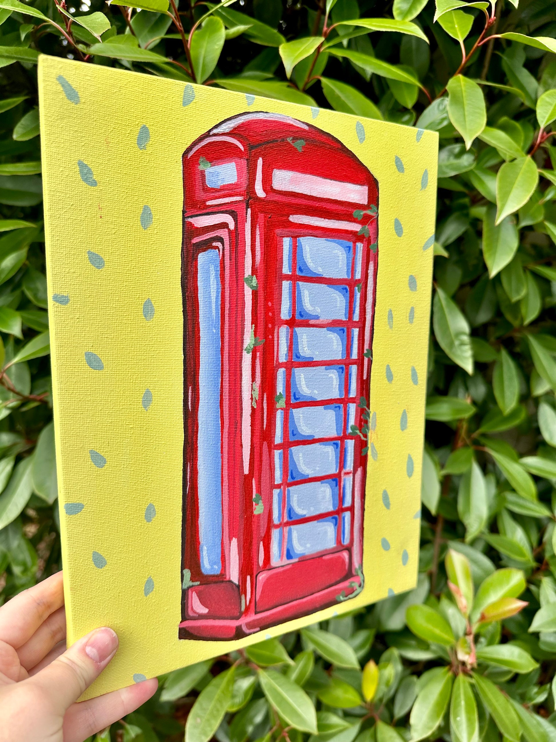 Original acrylic painting of a classic red British phone booth with ivy accents, set against a bright yellow background with playful blue details. A bold and colourful pop art-inspired design.(12 x 9 inches)