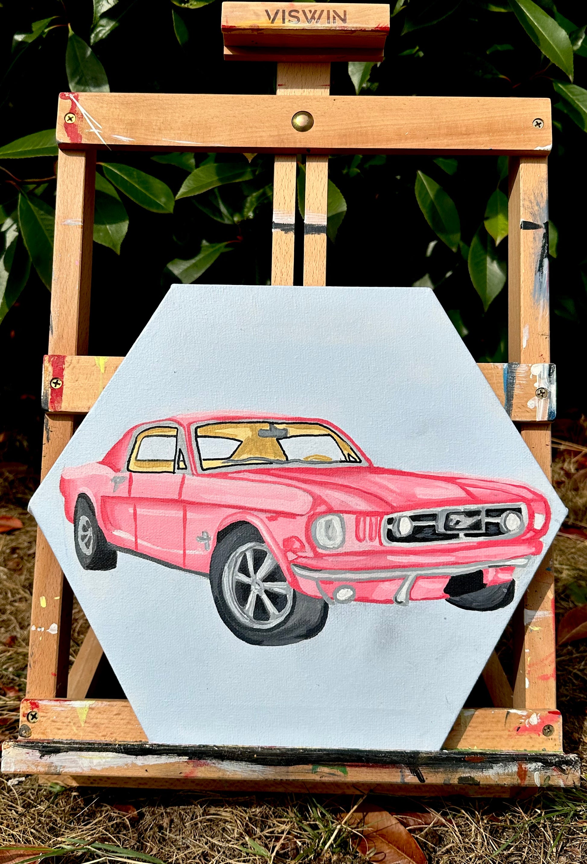 Original acrylic painting of a classic pink vintage car on a hexagon canvas. A bold and stylish piece perfect for car enthusiasts and retro art lovers.(13 x 9 inches)