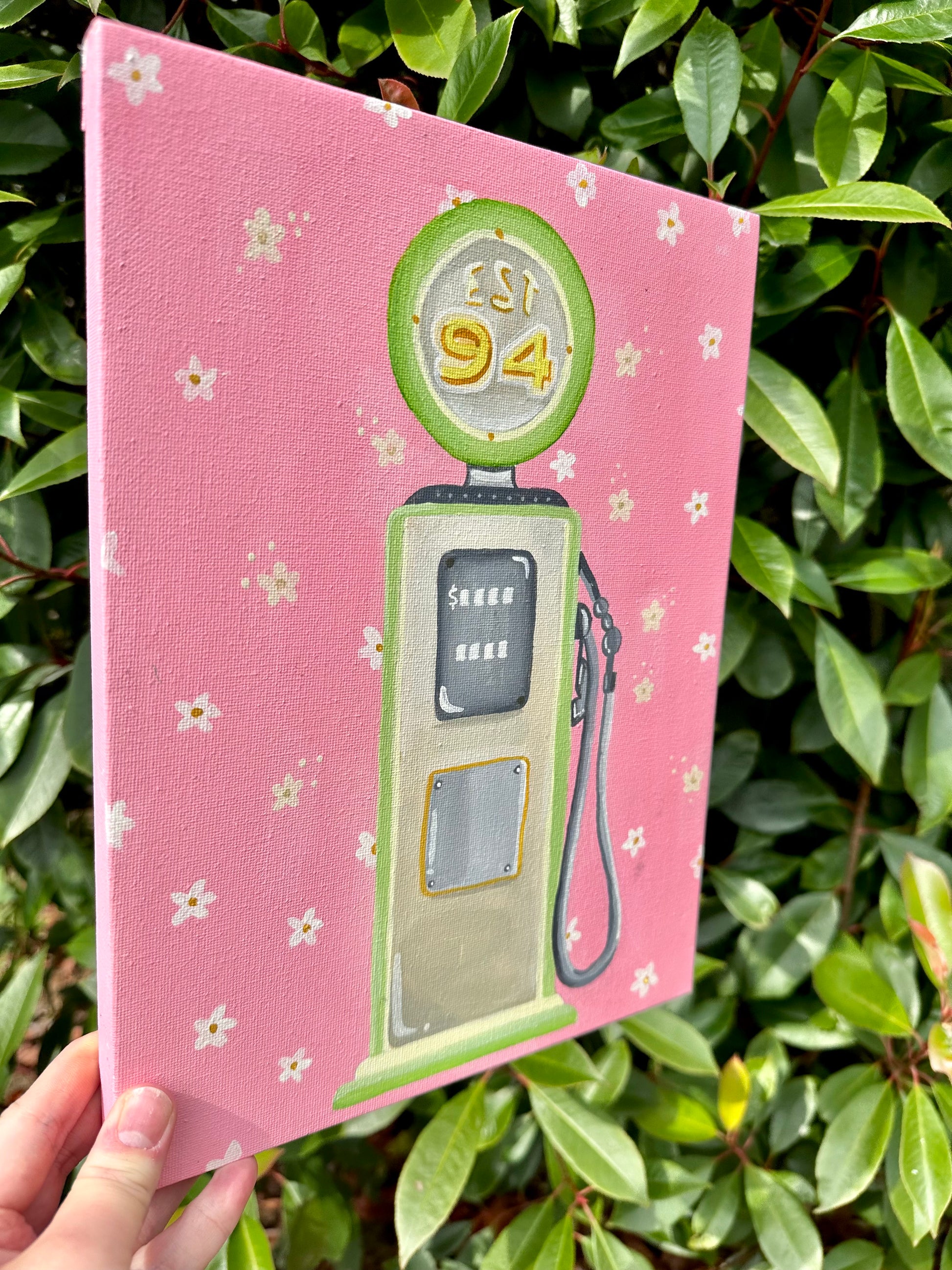 Original acrylic painting of a retro gas pump in soft green and yellow tones against a playful pink background with white flowers. A fun and nostalgic pop art-inspired piece.(12 x 9 inches)