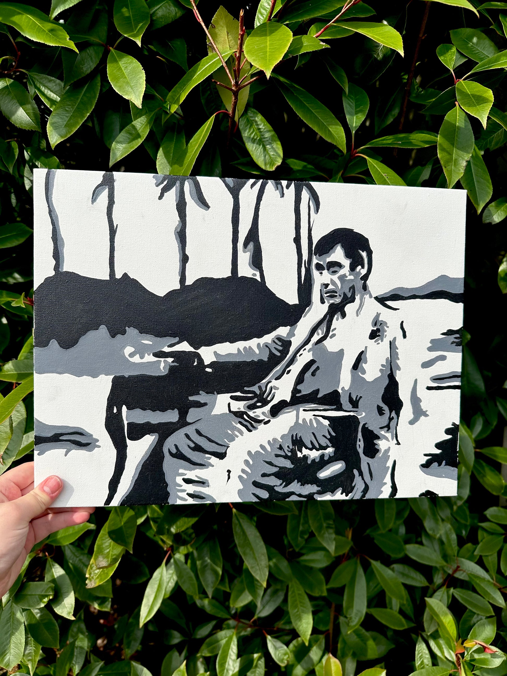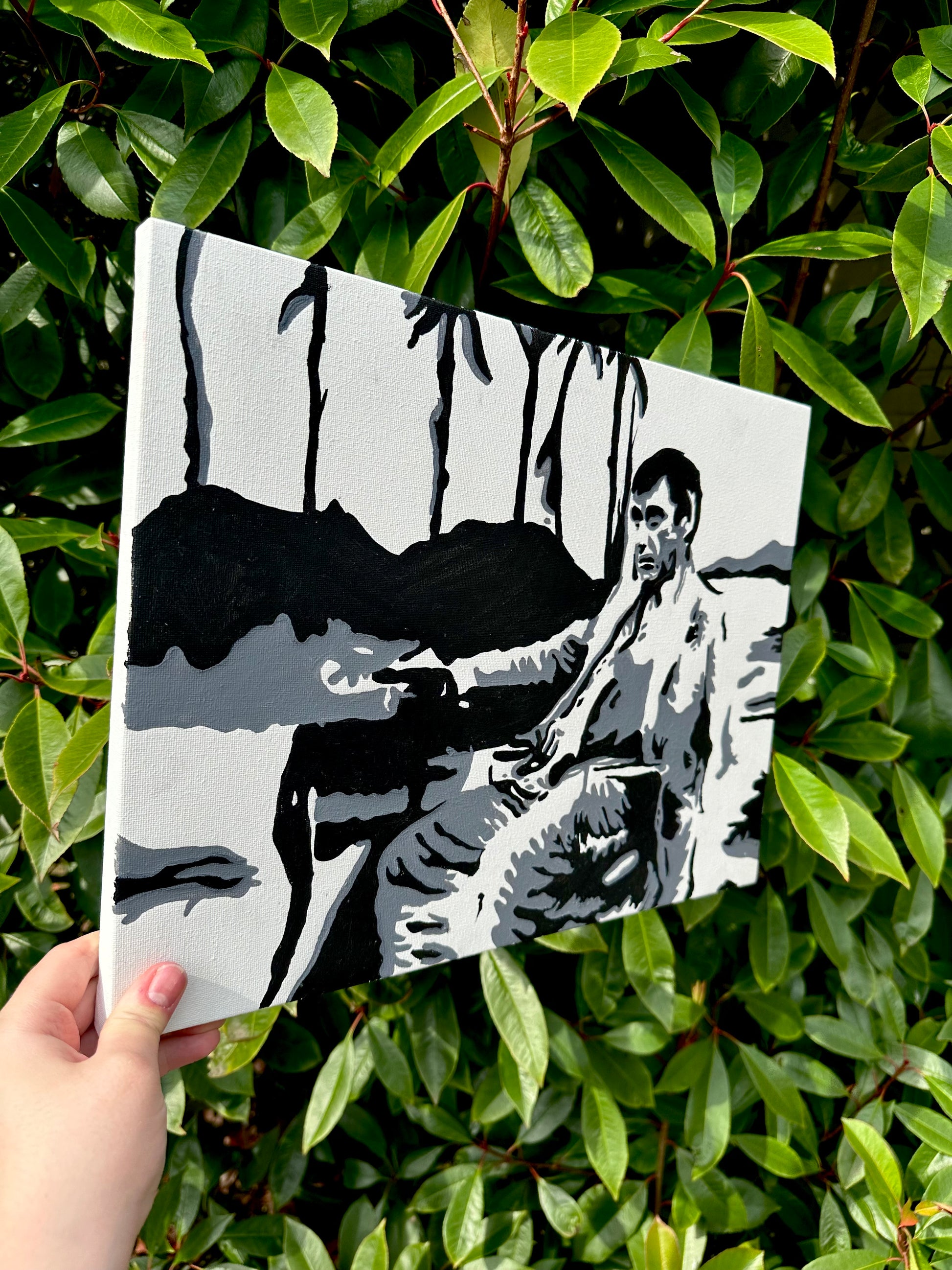 This acrylic painting presents a moody, scene featuring Scarface seated. Painted in a grayscale palette.This one-of-a-kind piece was created on a canvas board using only acrylic paint, merging minimalist colour with maximum emotional depth.(16 x 12 inches)