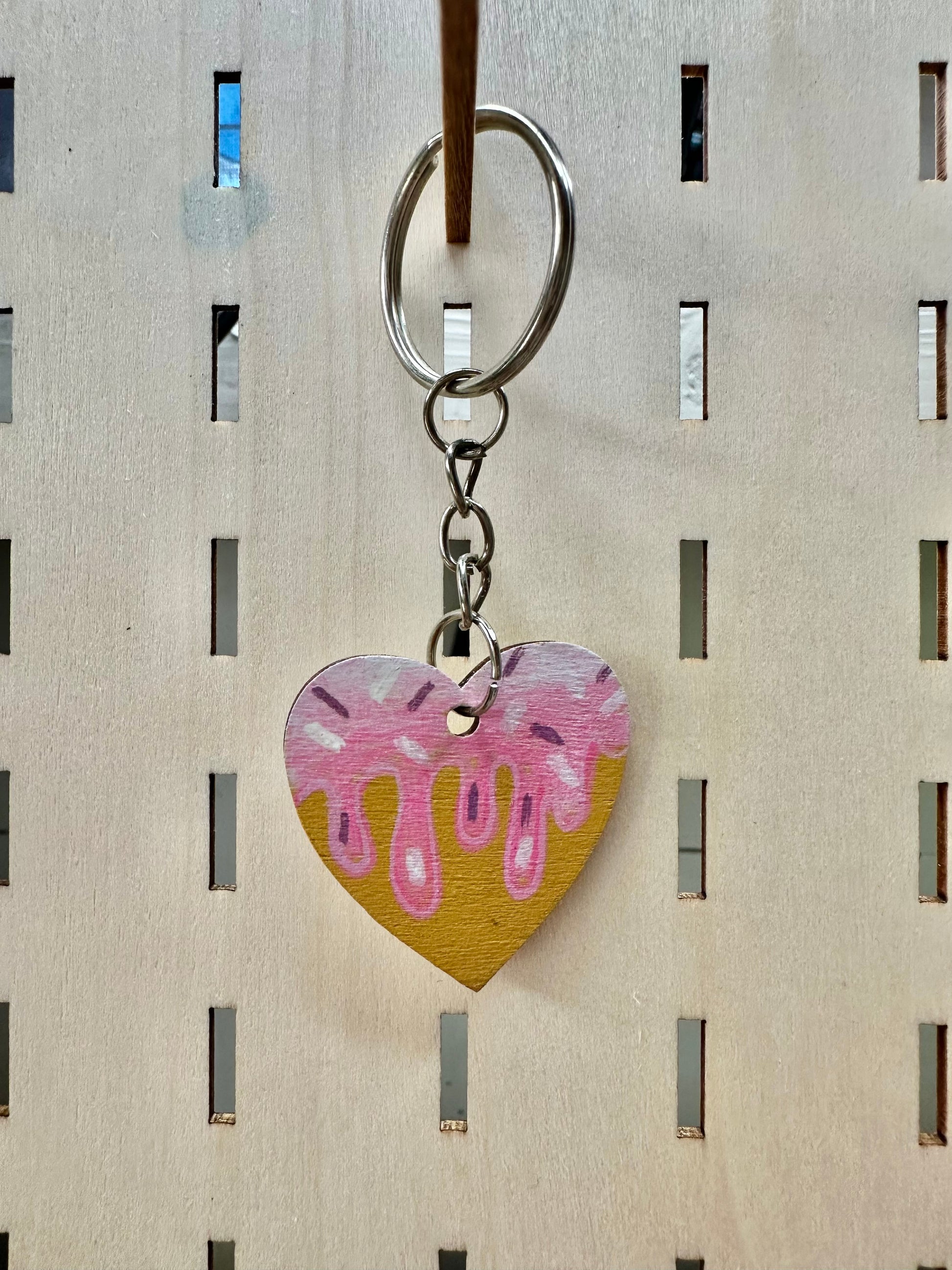 A handmade wooden keyring, carefully hand painted with acrylics and finished with a protective varnish for durability. Lightweight and sturdy, it’s ready to clip on to your keys, bag, or zipper pull adding a unique, handcrafted touch wherever you take.