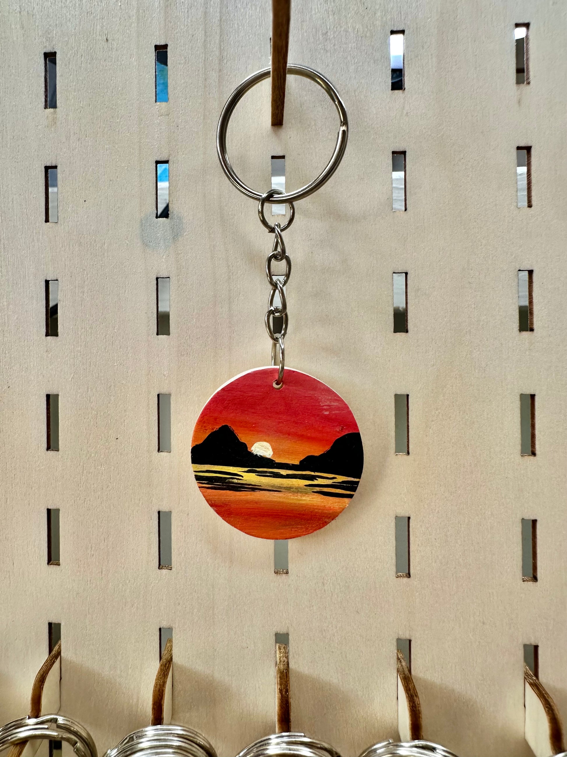 A handmade wooden keyring, carefully hand painted with acrylics and finished with a protective varnish for durability. Lightweight and sturdy, it’s ready to clip on to your keys, bag, or zipper pull adding a unique, handcrafted touch wherever you take.
